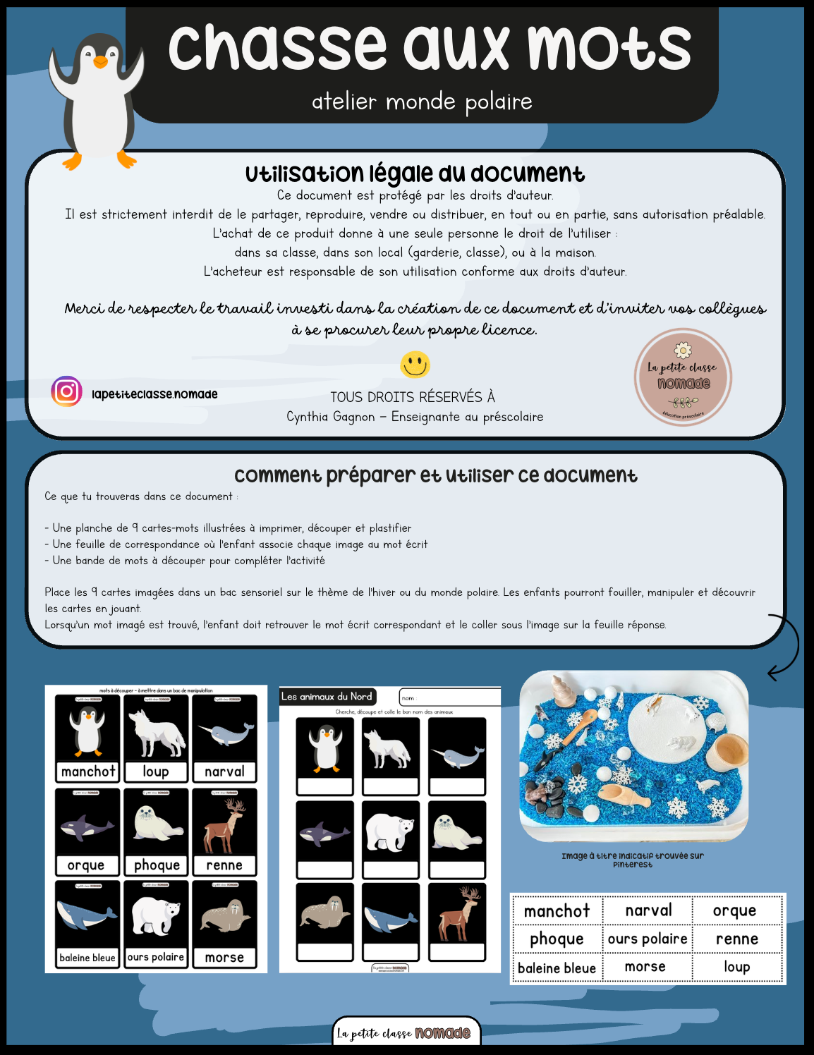 Place les 9 cartes imagées dans un bac sensoriel sur le thème de l’hiver ou du monde polaire. Les enfants pourront fouiller, manipuler et découvrir les cartes en jouant.