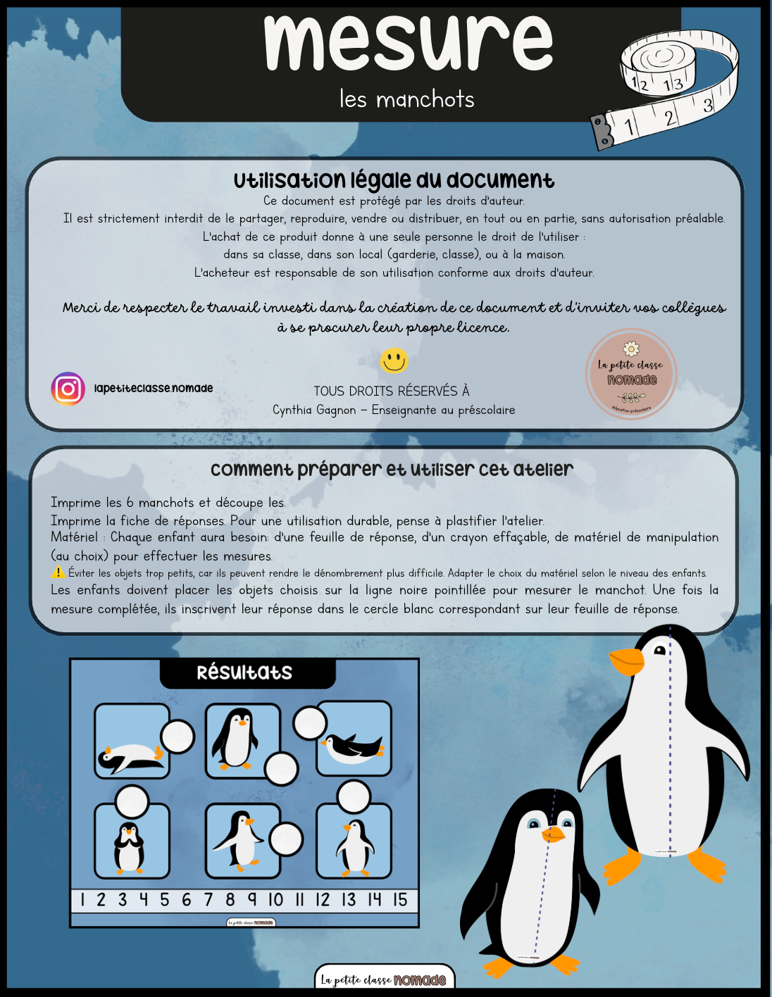 Les enfants doivent placer les objets choisis sur la ligne noire pointillée pour mesurer le manchot. Une fois la mesure complétée, ils inscrivent leur réponse dans le cercle blanc correspondant sur leur feuille de réponse.