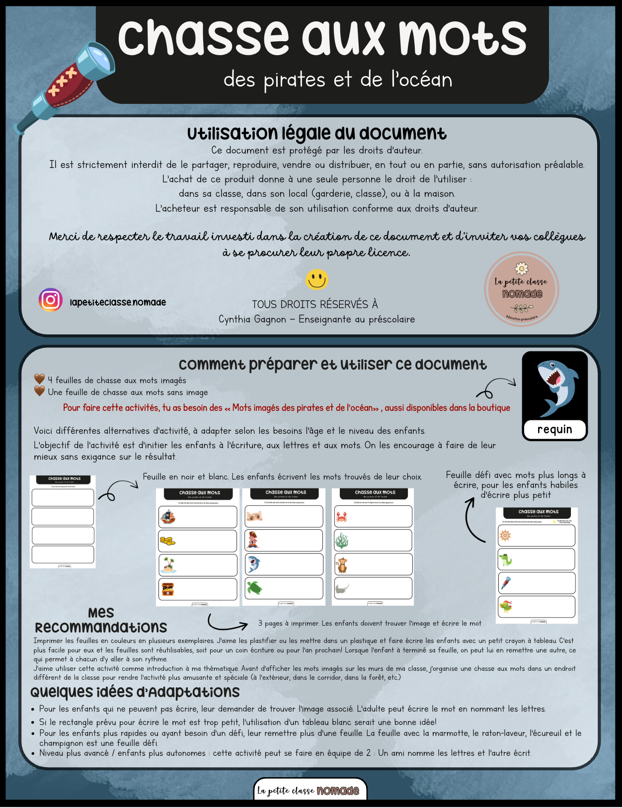 Imprimer les feuilles en couleurs en plusieurs exemplaires. J’aime les plastifier ou les mettre dans un plastique et faire écrire les enfants avec un petit crayon à tableau. C’est plus facile pour eux et les feuilles sont réutilisables, soit pour un coin écriture ou pour l’an prochain! Lorsque l’enfant à terminé sa feuille, on peut lui en remettre une autre, ce qui permet à chacun d’y aller à son rythme.