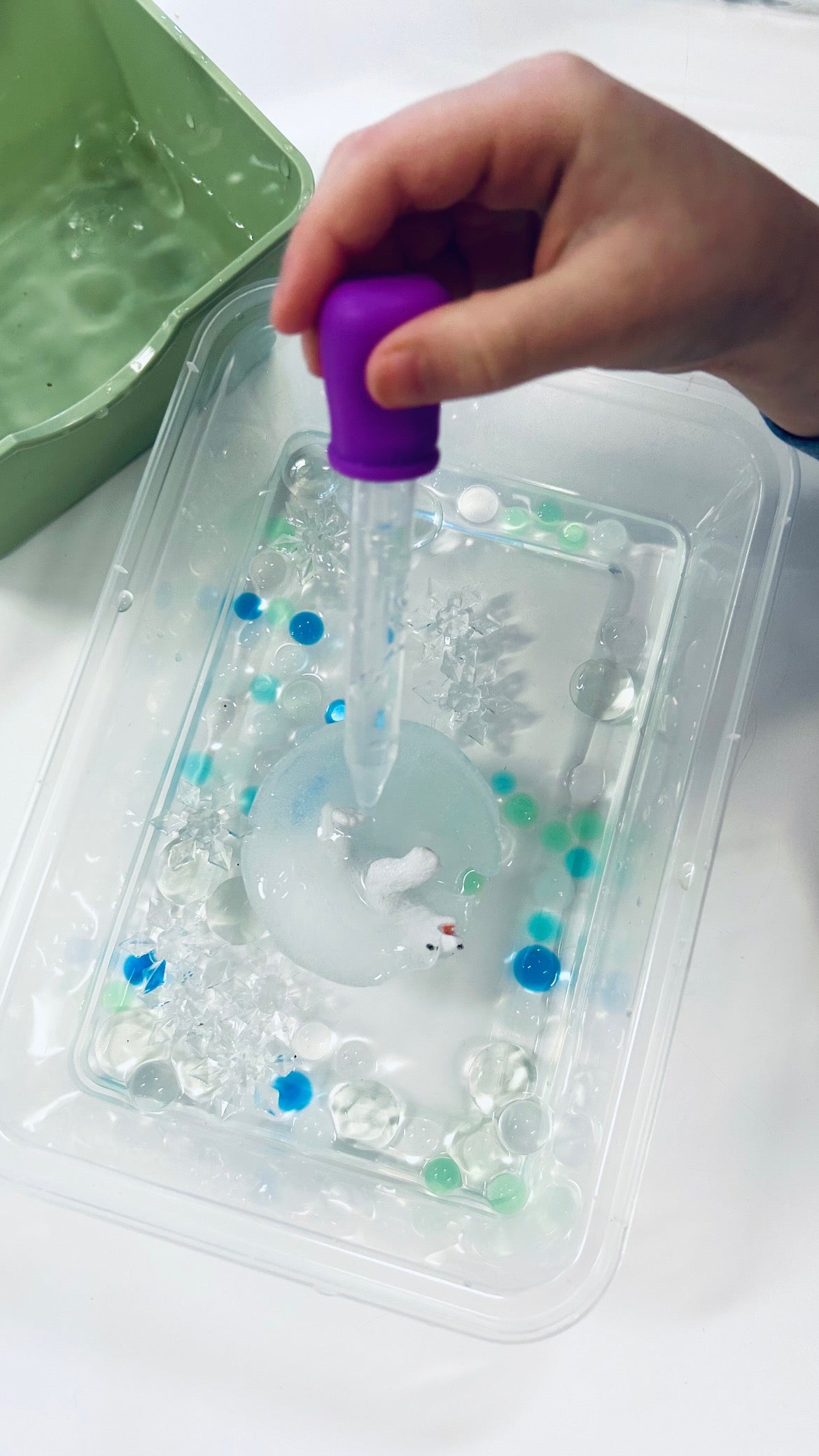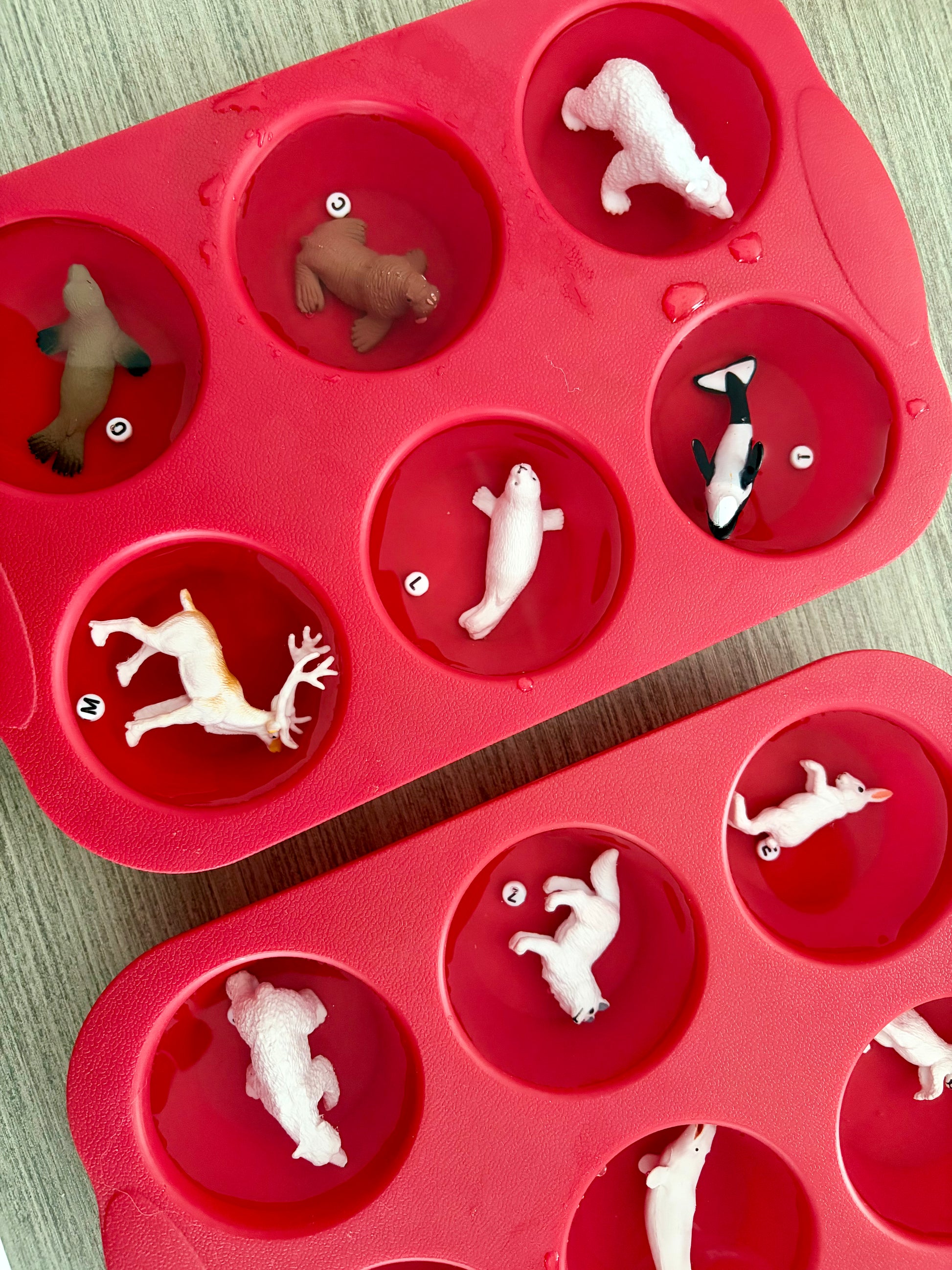Dans des moule à gâteau (ou autre), faire congeler une figurine du monde polaire accompagnée de perles de lettres ou de chiffres.