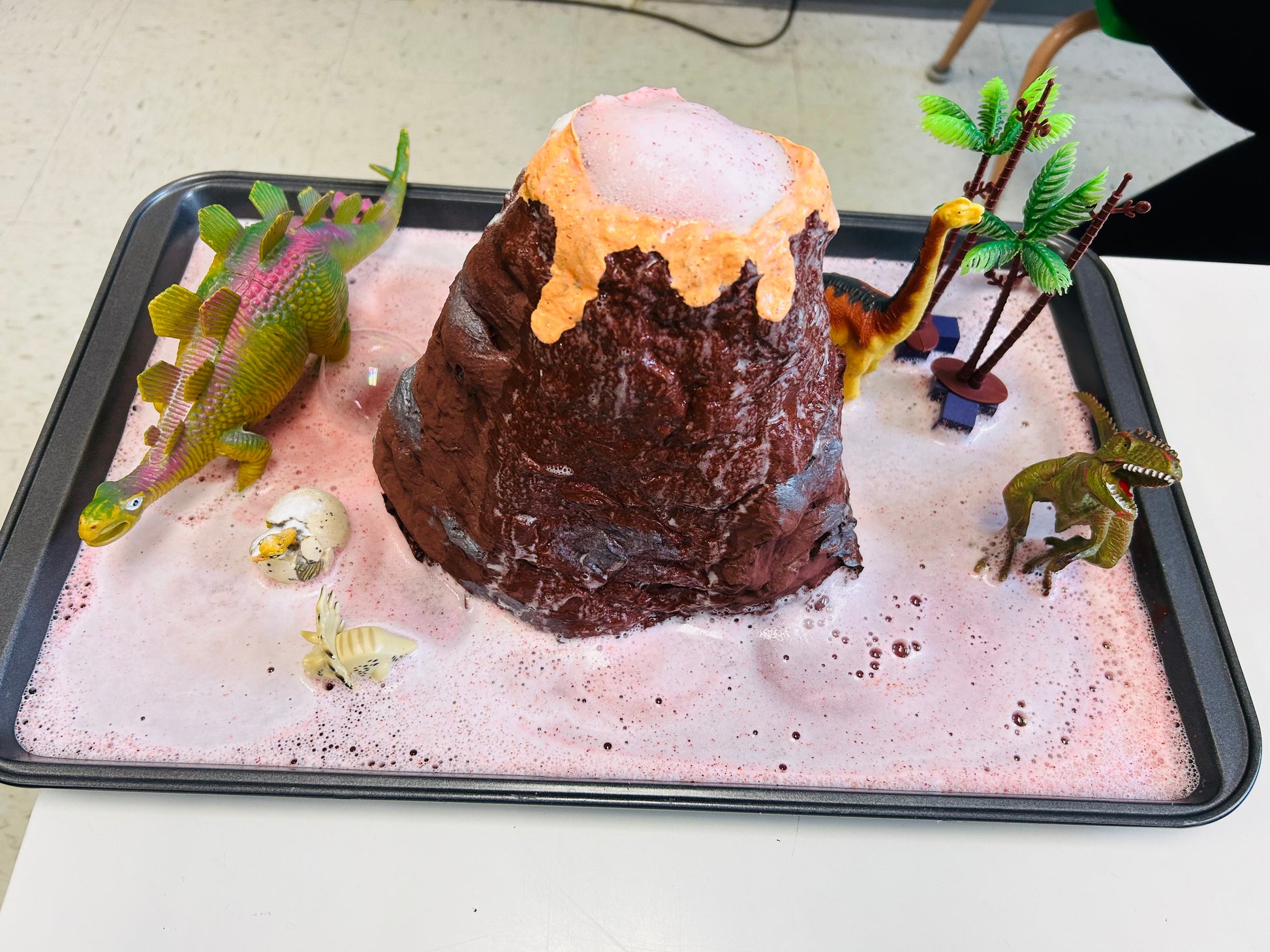 La semaine précédente, fabrique un volcan avec tes élèves. Tu peux utiliser du papier journal et de la colle blanche (prévois du temps pour le séchage) ou de la pâte à sel. Peins-le avec eux. Lorsque tu construis la structure, assure-toi qu’elle permette d’insérer un verre ou un pot Mason à l’intérieur. Le rebord doit arriver exactement à l’ouverture du volcan.