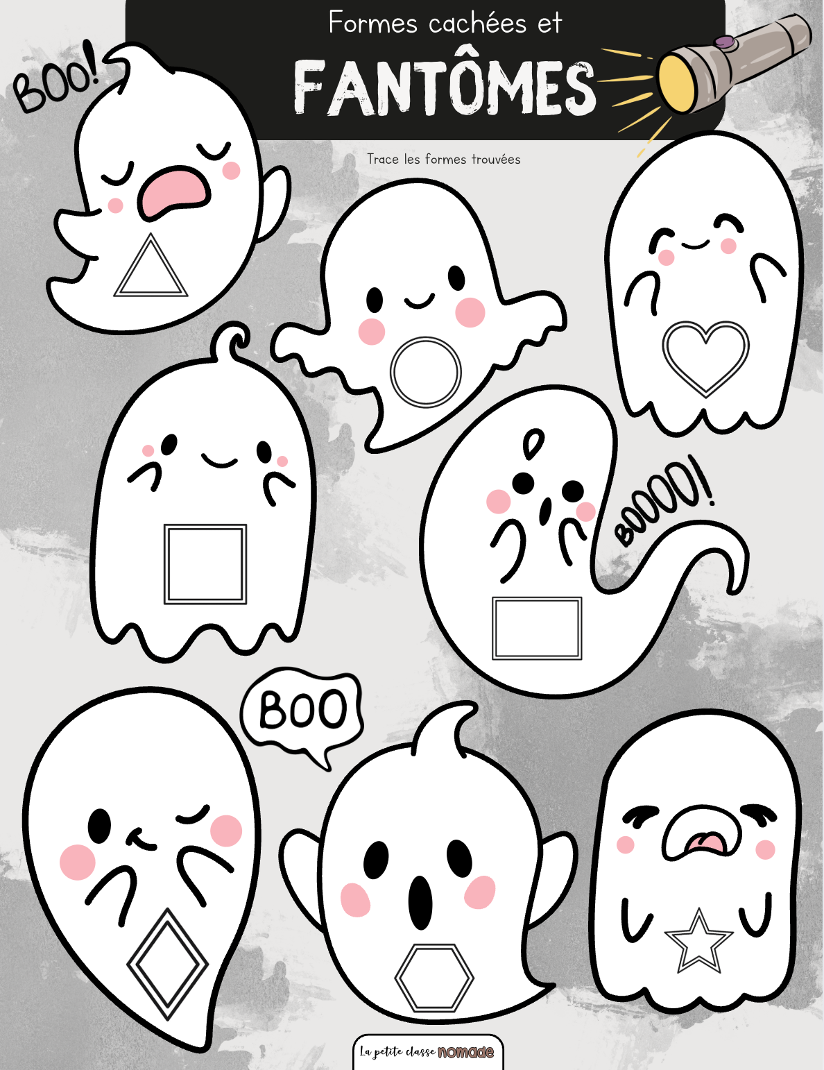 Cette activité peut être proposée sous forme d’atelier, soit en l’intégrant dans un bac sensoriel (voir image), soit en organisant une chasse aux formes en cachant les fantômes un peu partout dans le local. Les enfants doivent retrouver les fantômes, découvrir la forme cachée à l’aide de la lumière, puis l’associer en la traçant sur leur feuille de réponse.