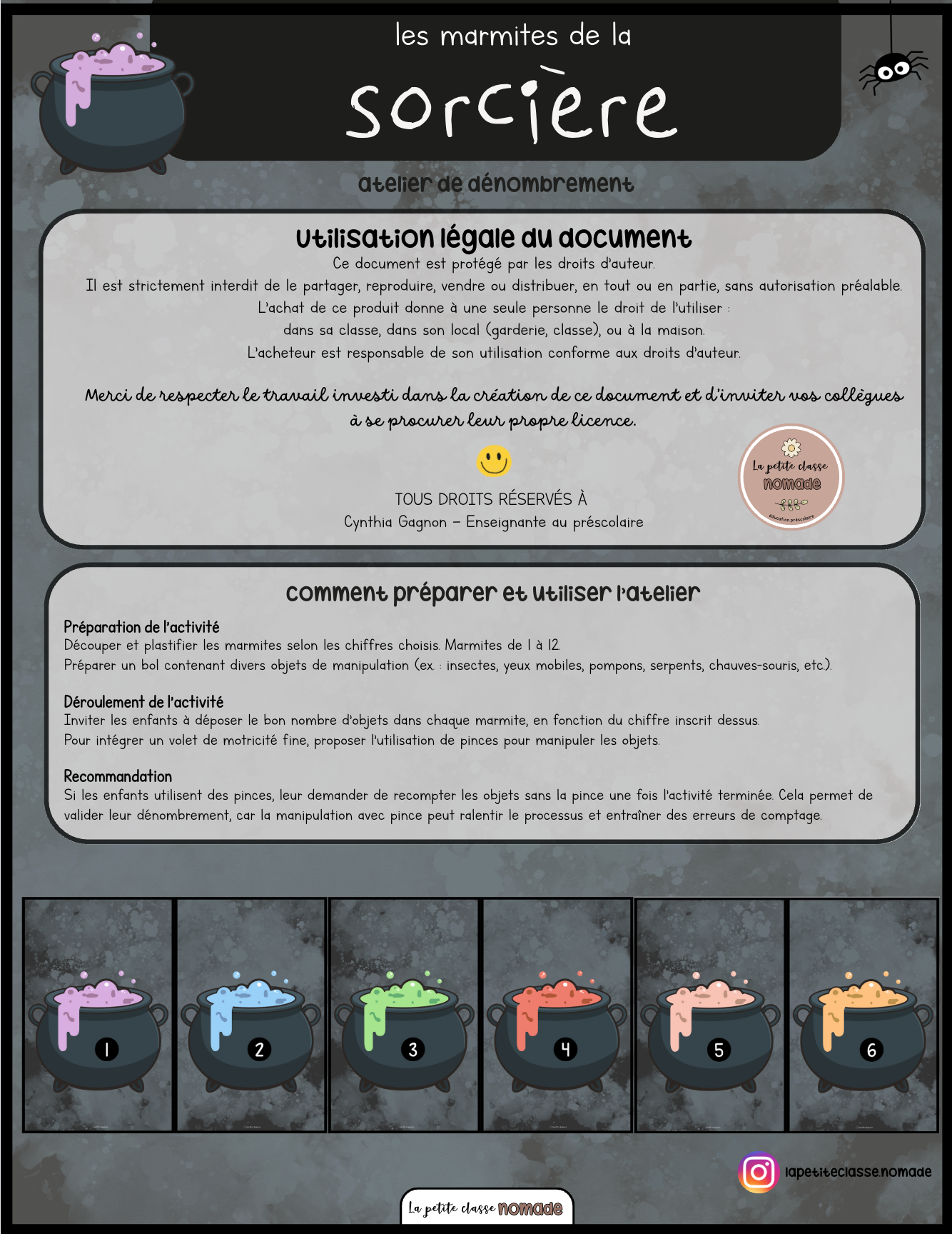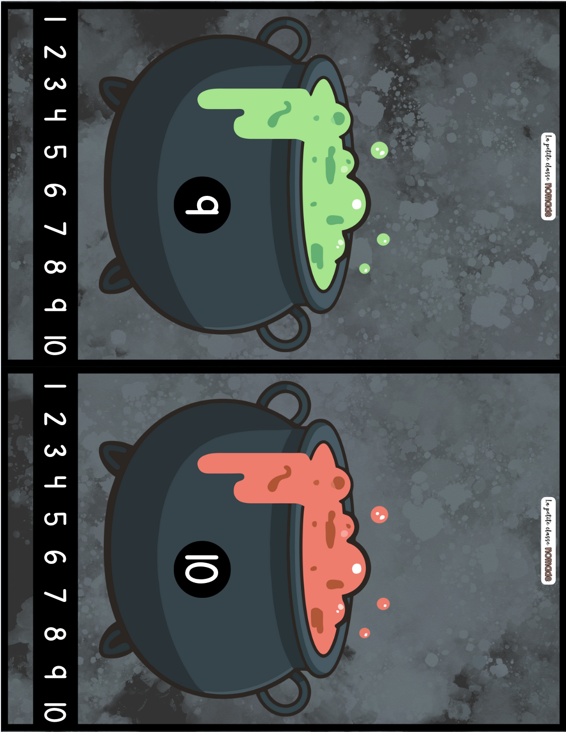 Inviter les enfants à déposer le bon nombre d’objets dans chaque marmite, en fonction du chiffre inscrit dessus.