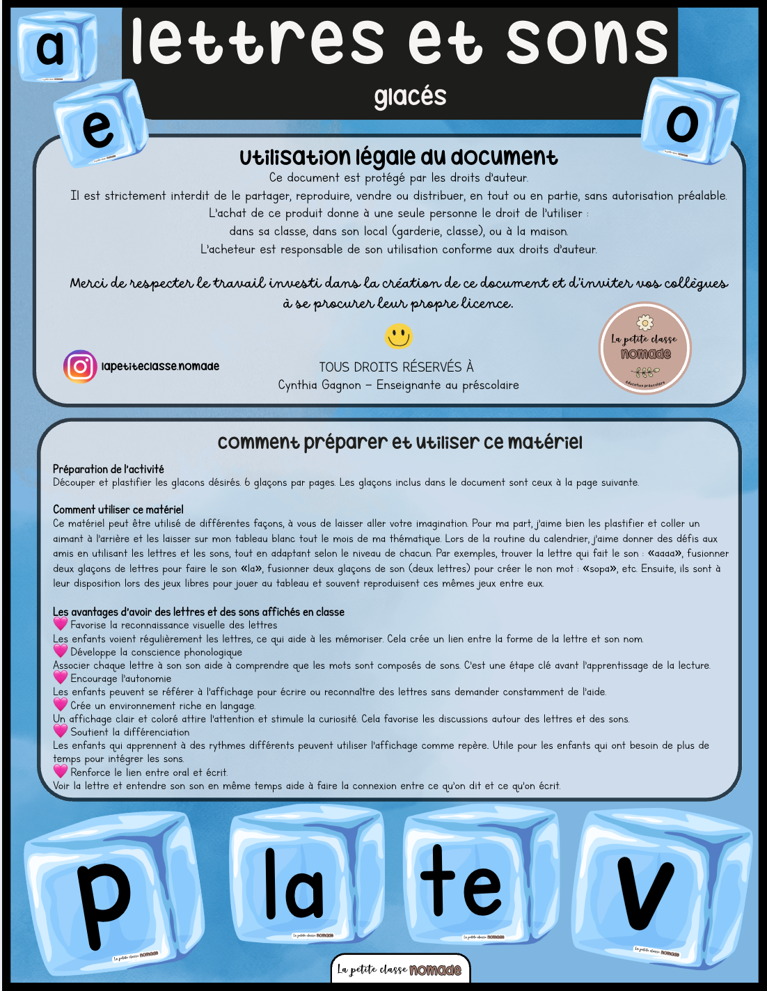Ce matériel peut être utilisé de différentes façons, à vous de laisser aller votre imagination. Pour ma part, j’aime bien les plastifier et coller un aimant à l’arrière et les laisser sur mon tableau blanc tout le mois de ma thématique. Lors de la routine du calendrier, j’aime donner des défis aux amis en utilisant les lettres et les sons, tout en adaptant selon le niveau de chacun. Par exemples, trouver la lettre qui fait le son : «aaaa», fusionner deux glaçons de lettres pour faire le son «la», fusionner deux glaçons de son (deux lettres) pour créer le non mot : «sopa», etc. Ensuite, ils sont à leur disposition lors des jeux libres pour jouer au tableau et souvent reproduisent ces mêmes jeux entre eux.