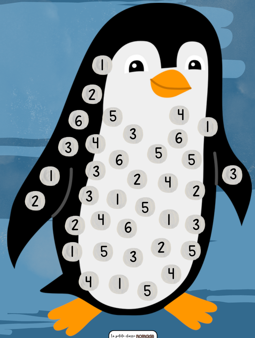 Par exemple, si l’enfant lance le dé et obtient 3, il couvre un cercle portant le chiffre 3 à l’aide d’un jeton, d’un pompon ou en le coloriant avec un crayon effaçable.