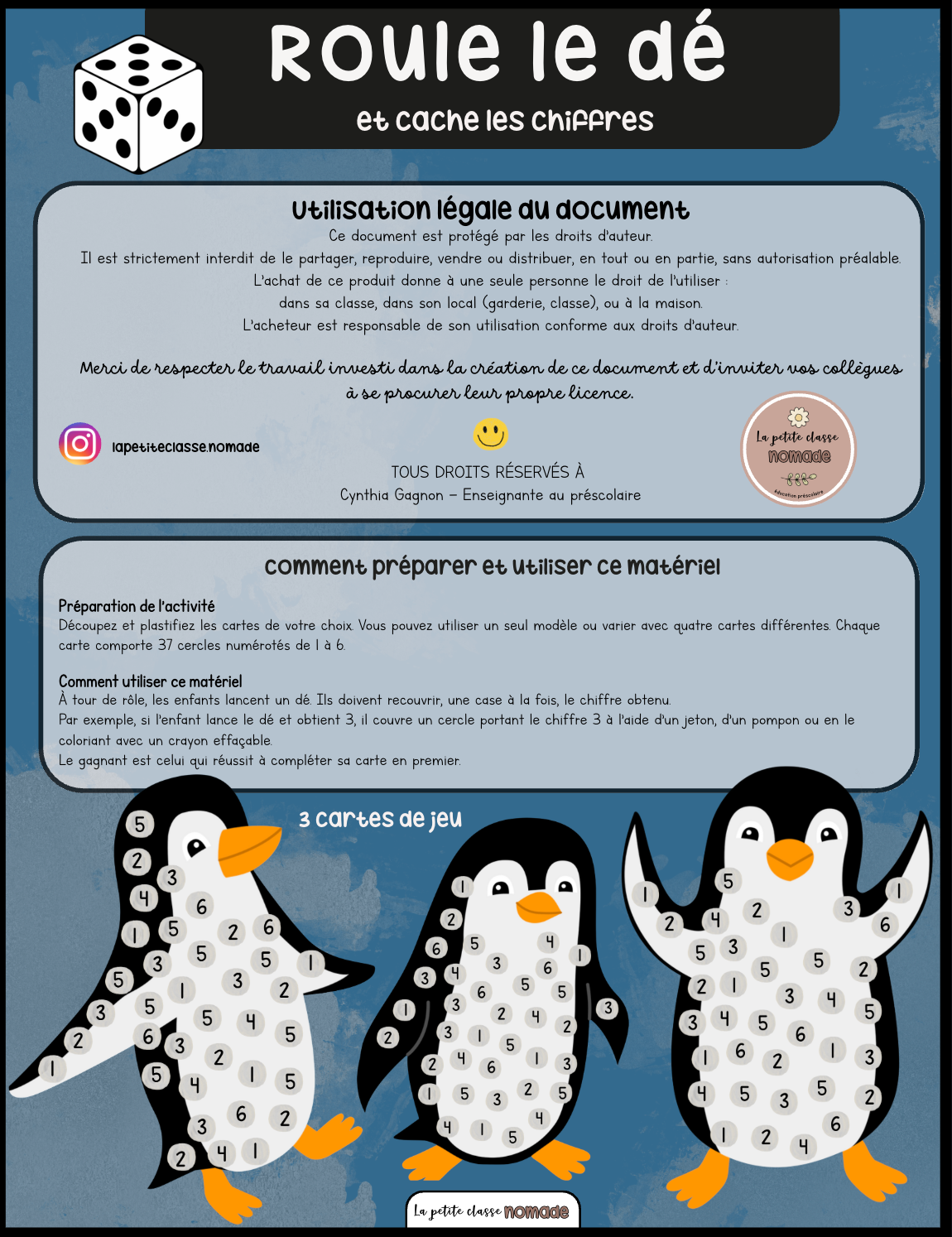 Découpez et plastifiez les cartes de votre choix. Vous pouvez utiliser un seul modèle ou varier avec quatre cartes différentes. Chaque carte comporte 37 cercles numérotés de 1 à 6.